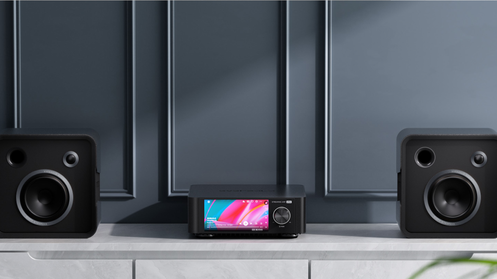 整机采用 CNC 加工一体成型结构,搭配高强度铝合金材质,有效屏蔽外部电磁干扰。5.5 英寸的大尺寸显示屏搭配全新 UI,操作直观流畅,而电源/音量旋钮周围的 RGB 灯环则在聆听过程中增添一抹时尚色彩。